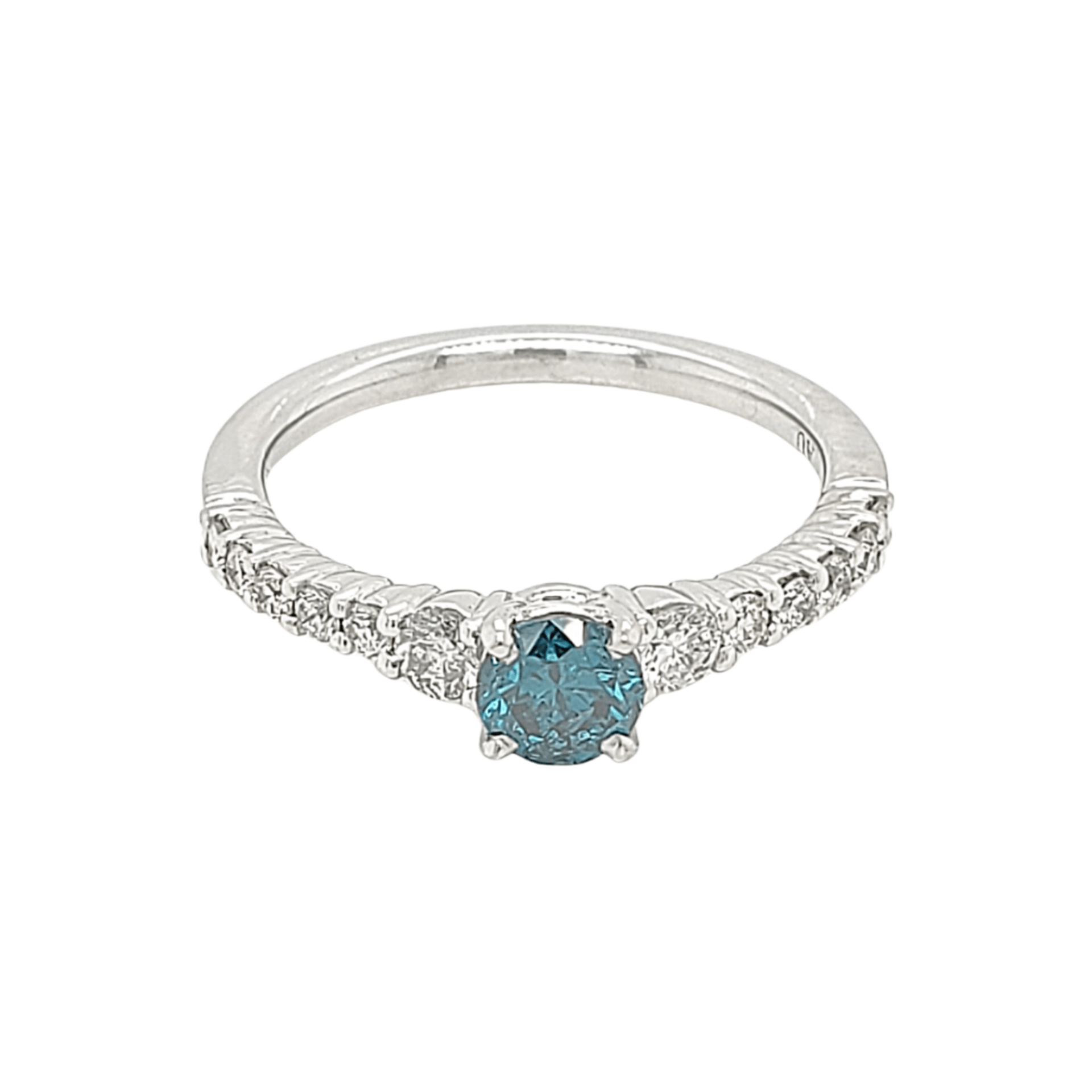 Lab Grown Brilliant Blue Diamond: .66ct. VS2 Blue (with a tint of green) Twenty-Two Brilliant Diamonds: .50cttw. SI2 I